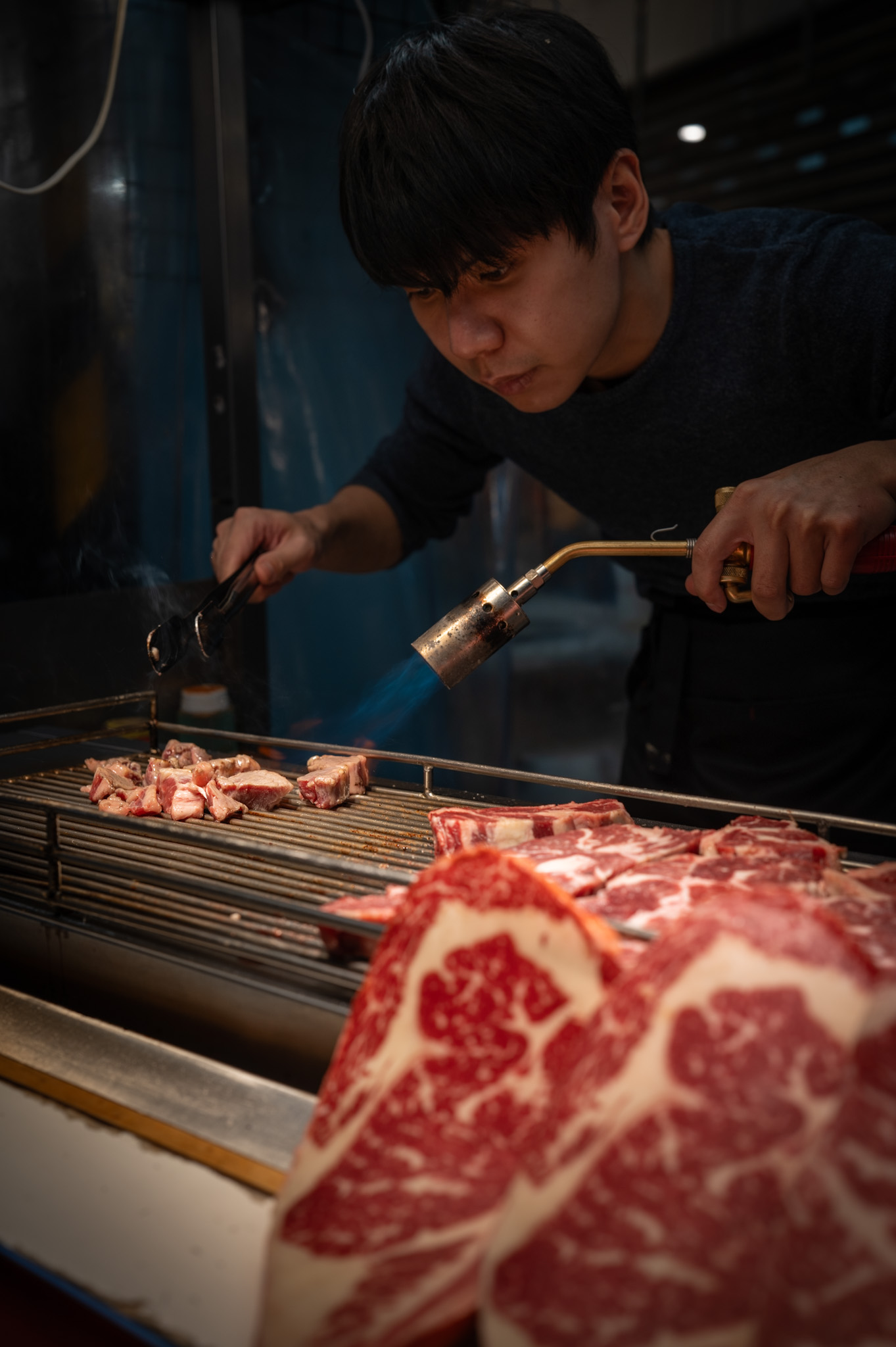 sculptor: tongs in one hand, a blowtorch in the other. The flame sketches its blue arc across the meat, sealing in juices, carving out flavor in seconds.