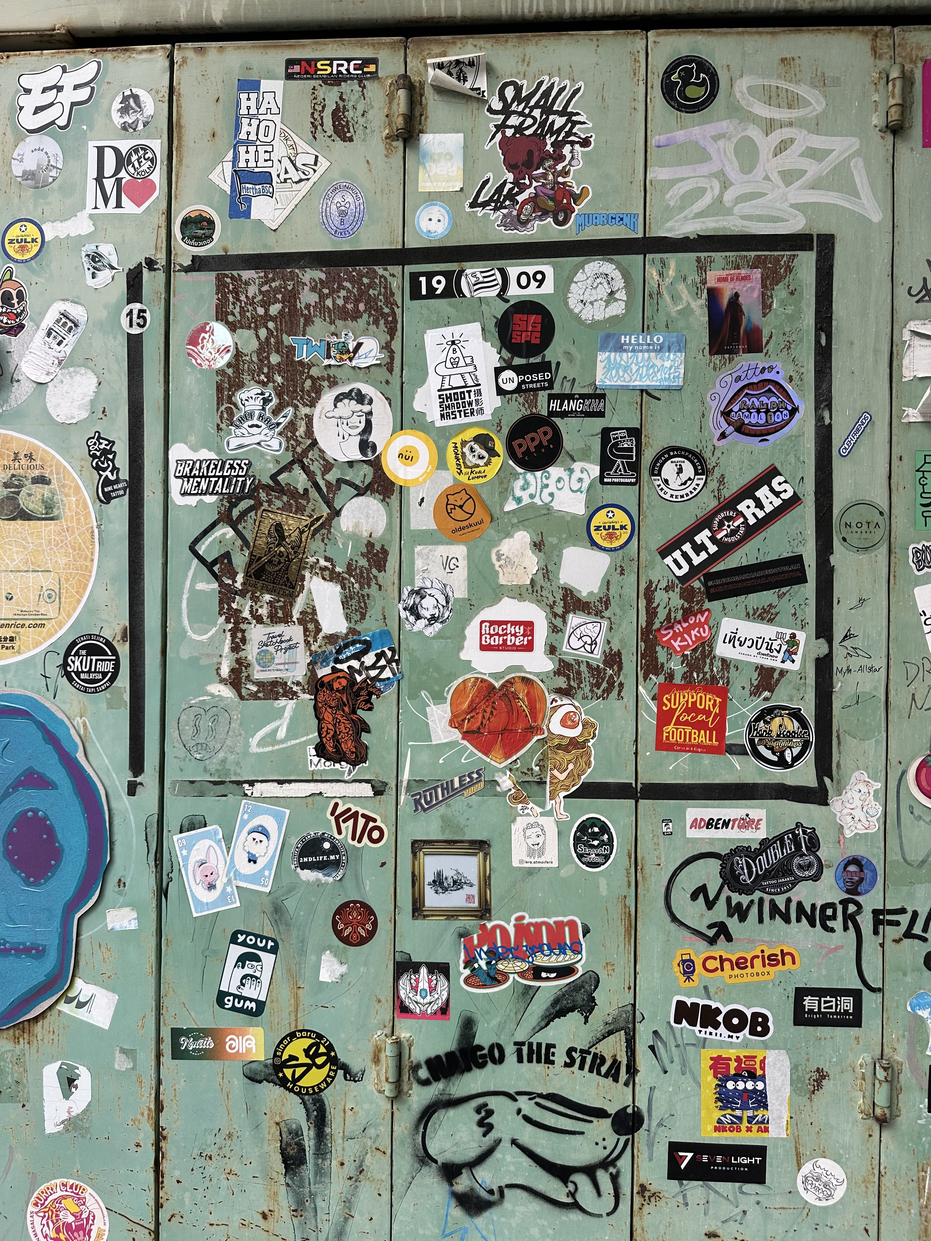 stickers. These small, adhesive artworks, often no larger than a palm, carry with them the signatures of local artists, global travelers, and anonymous dreamers. They are fragments of identity, rebellion, and humor, layered upon one another in a visual dialogue that stretches from Seoul’s alleyways to Penang’s back doors.
