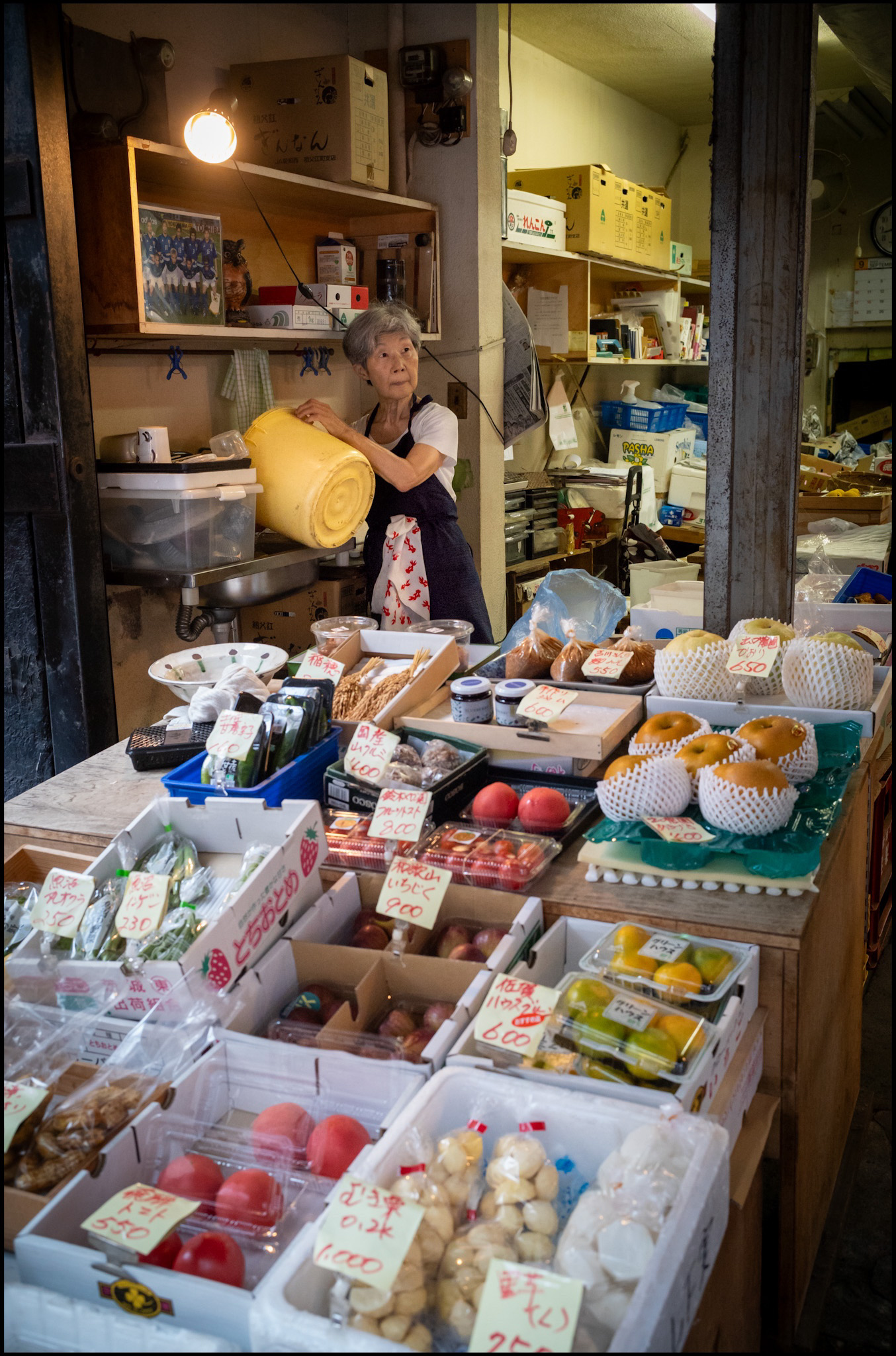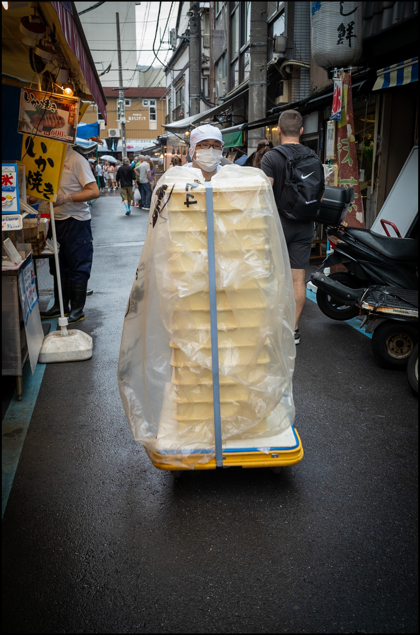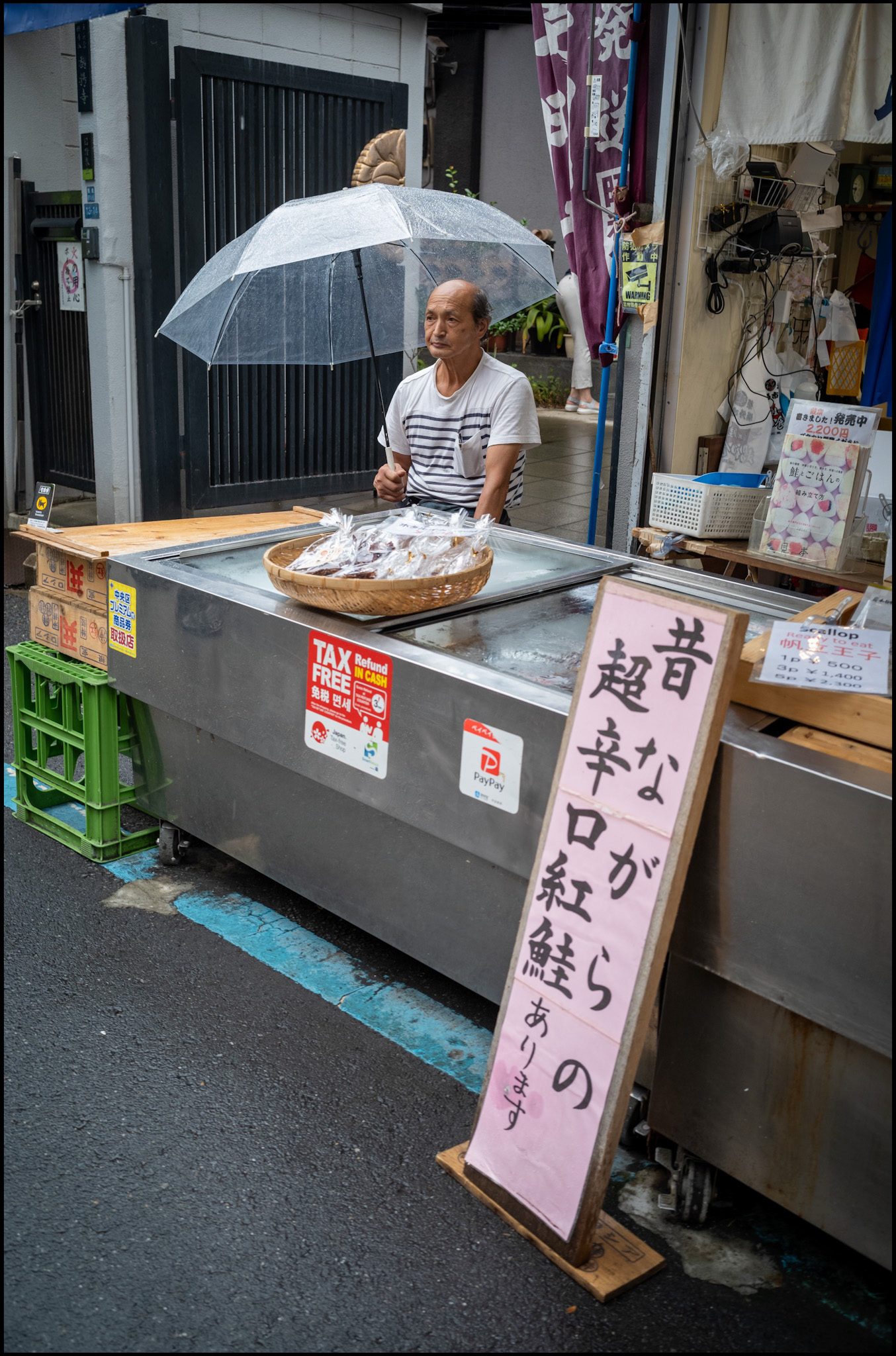 I move slowly with my camera, letting the chaos settle into small, intimate scenes — a vendor laughing, a bowl of ramen warming cold hands, the quiet pride of those who have worked here for generations. Tsukiji today is nostalgia in motion, a market surviving in stories and light: I was trying to capture that light with my